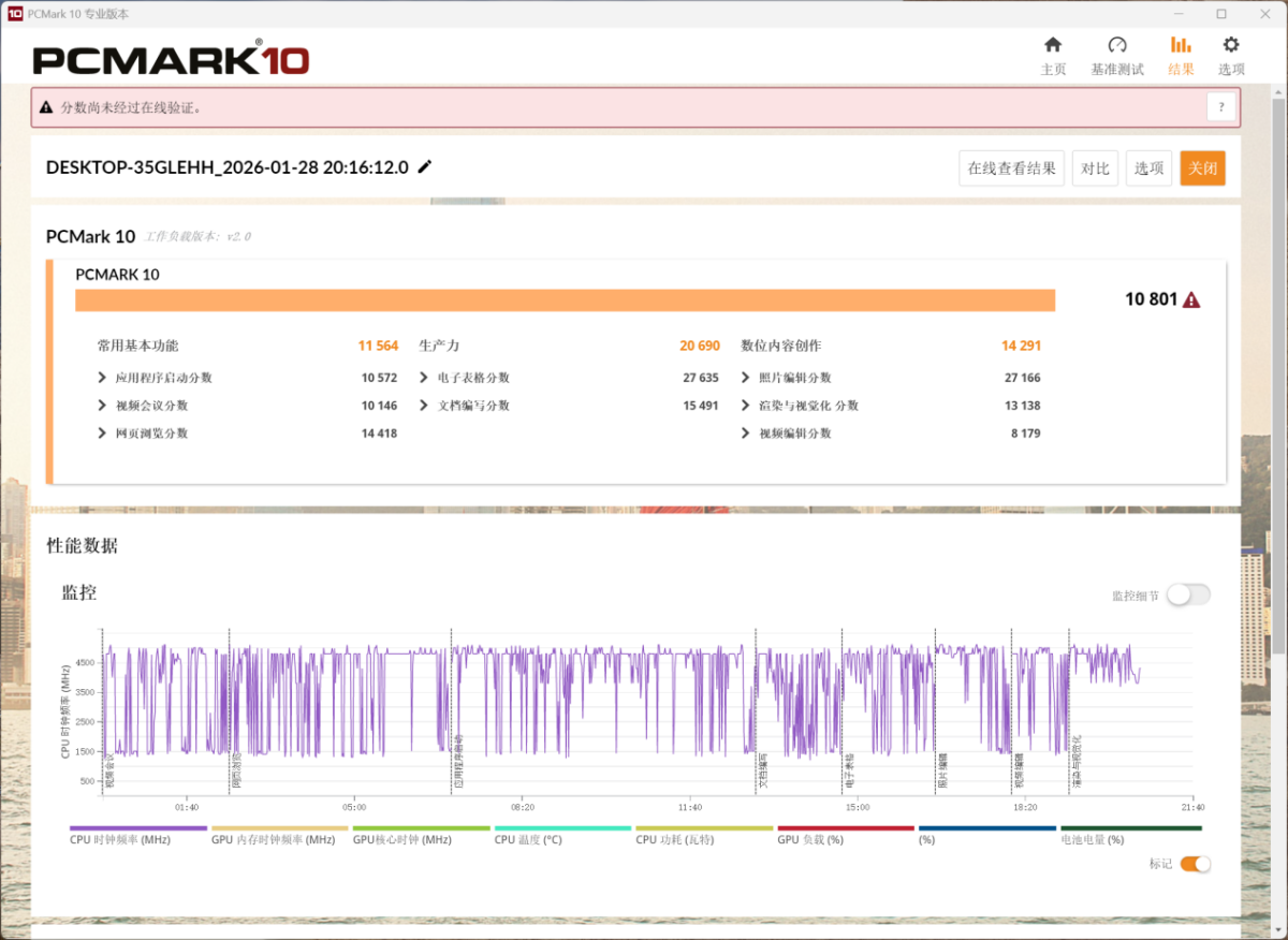 仍旧是笔记本模式(启用单屏),同样的设定下,连接Wi-Fi,通过PCMark 10现代办公模式进行续航测试。最终华硕灵耀14双屏2026的续航时间达到了24小时,相比上代产品的13小时几乎翻了一倍,而且性能评分提升超过了50%。